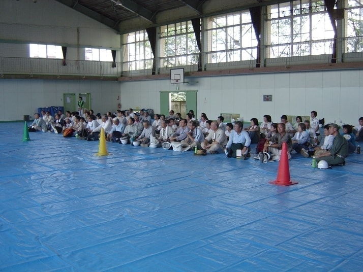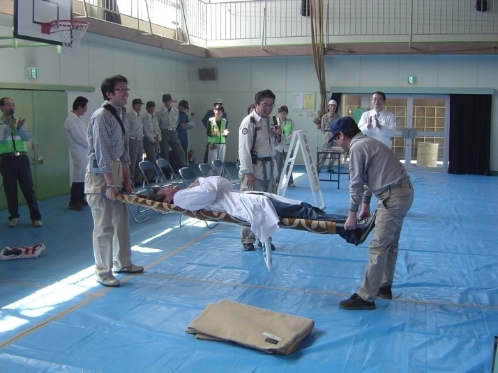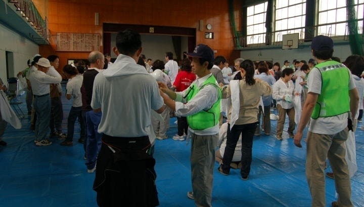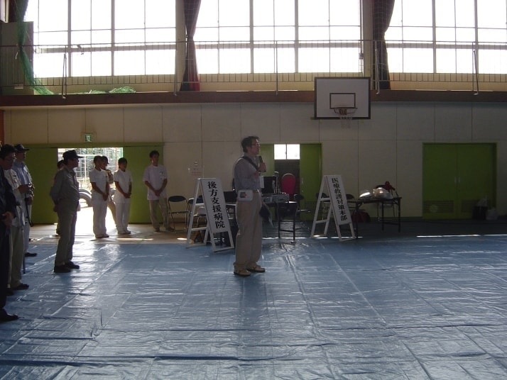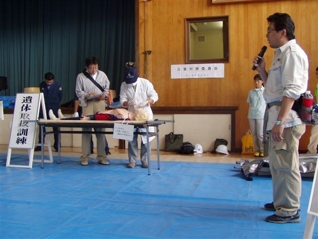 訓練は例年通り医療救護所での救護活動の流れを参加地域住民に解説し、トリアージの意義や本会の災害時の活動内容・身元確認時の口腔内所見の重要性を説明、また簡易担架の作り方や三角巾の使い方を指導補助を行いました。当日は曇りで幾分すごしやすい日でしたが、狭い体育館での訓練参加住民の中には具合の悪くなる方もおり、参加会員も実戦さながらの苦労をしました。
