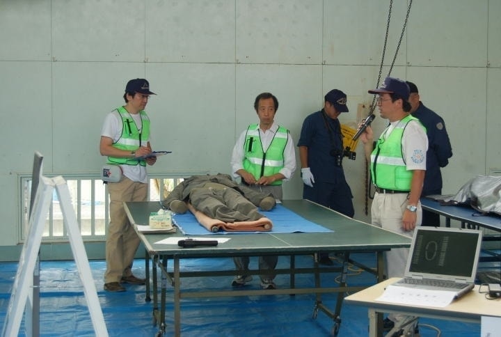 応急訓練・トリアージ訓練後遺体取扱訓練が行われ、警察による検視・検案、歯科による身元確認デンタルチャート記入のデモを行い、スムースな身元確認には歯型治療痕の判別が不可欠であり、家族のかかりつけ医を把握するファミリーコミュニケーションの必要性、災害時医療救護所で使用するポータブルユニットの展示紹介を行いました。