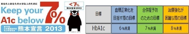 糖尿病の医療の基本は生活習慣の改善により代謝状態とりわけ血糖コントロールを保つことにあります。日本糖尿病学会では治療目標をわかりやすい形で発表し、「熊本宣言2013」として広く国民に呼びかけていくこととしました。
